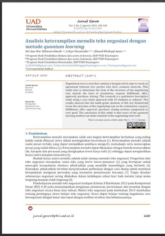 Negotiation text is a text that contains a bargain which aims to reach an agreement between two parties who have common interests. This study aims to determine the form of the structure of the negotiating text, namely the form of orientation, request, fulfillment, offer, approval, purchase, closing. This research is a qualitative descriptive study using a case study approach with 23 students as subjects. The results showed that the tenth grade students of MA Asy-Syukuriyah wrote the structure of the negotiating text on the orientation, request, fulfillment, offer, approval, purchase, closing sections categorized as very good. The conclusion of this study is that users of the quantum learning method can make students write negotiating texts well.
