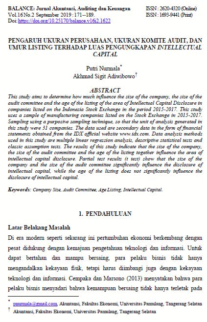 This study aims to determine how much influence the size of the company, the size of the audit committee and the age of the listing of the area of Intellectual Capital Disclosure in companies listed on the Indonesia Stock Exchange in the period 2015-2017. This study uses a sample of manufacturing companies listed on the Stock Exchange in 2015-2017. Sampling using a purposive sampling technique, so that the unit of analysis generated in this study were 31 companies. The data used are secondary data in the form of financial statements obtained from the IDX official website www.idx.com. Data analysis methods used in this study are multiple linear regression analysis, descriptive statistical tests and classic assumption tests. The results of this study indicate that the size of the company, the size of the audit committee and the age of the listing together influence the area of intellectual capital disclosure. Partial test results (t test) show that the size of the company and the size of the audit committee significantly influence the disclosure of intellectual capital, while the age of the listing does not significantly influence the disclosure of intellectual capital.