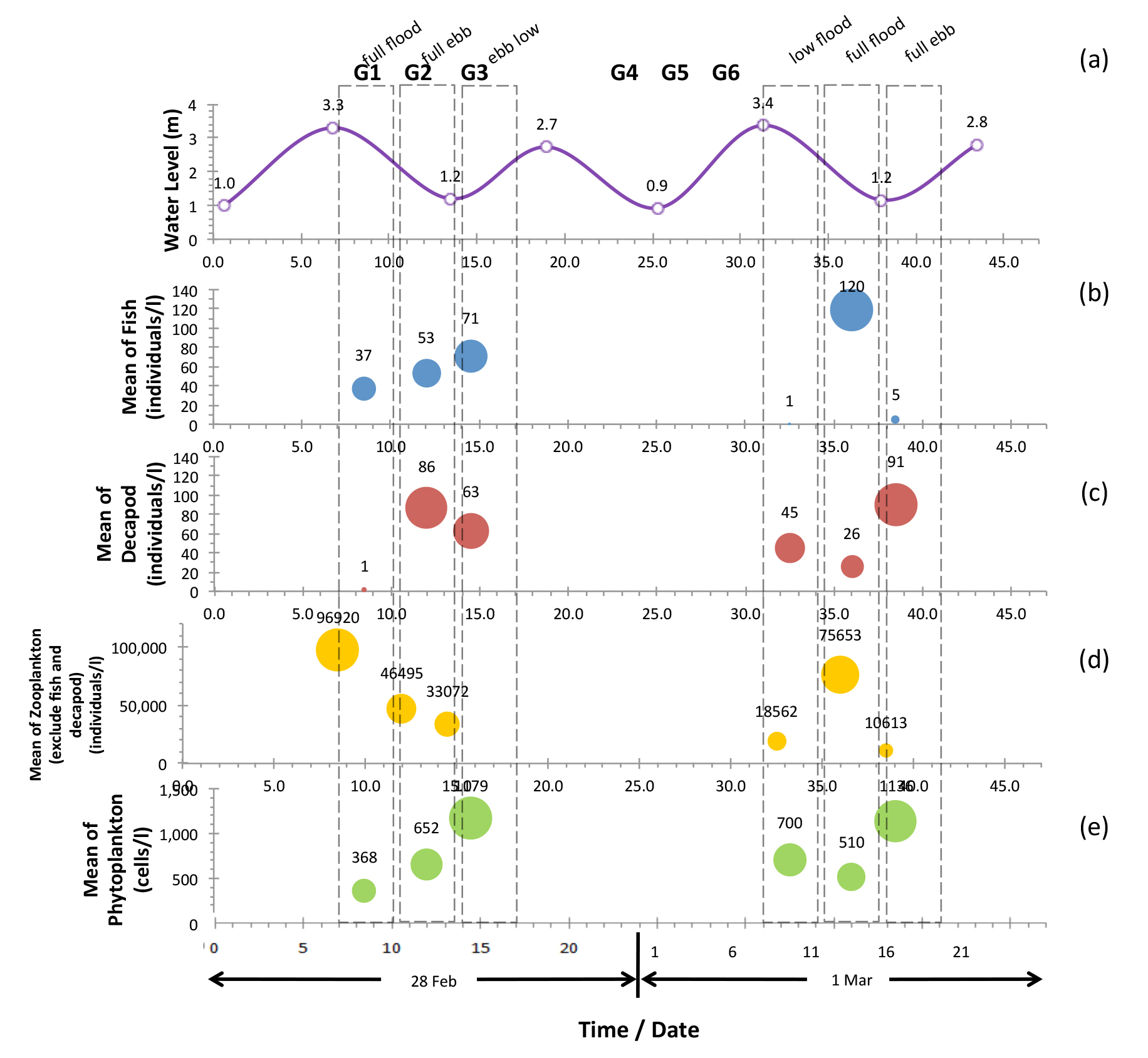 Spatial and temporal variations in the fish and decapod communities were investigated at three stations in Cleveland Bay along with other zooplankton and phytoplankton communities. The linkage between biological assemblages and physical properties of the ocean was explained to develop better understanding of population dynamic of planktonic communities. Biological and physical properties data were gathered in 3 stations by 6 different trips. The results show that there is a significant association between daytime and tidal period to the abundance of planktonic communities (P < 0.05). Spatial distribution of fish and decapod communities are likely explained by “predator pit” and “match/mismatch” concepts to increase the survival probability along with physical properties of the ocean.