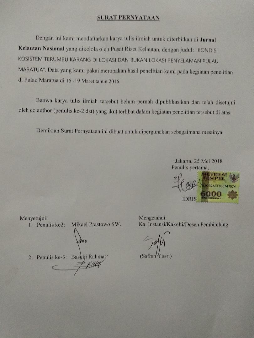 Terumbu karang Indonesia memiliki ancaman kerusakan tertinggi di dunia. Upaya-upaya konservasi membutuhan data dan informasi ilmiah yang akurat. Kegiatan non ekstraktif seperti wisata bahari memberikan pengaruh terhadap kondisi terumbu karang, wisatawan yang menikmati keindahan alam bawah laut melalui diving ataupun snorkeling dapat mempengaruhi perubahan kondisi ekosistem terumbu karang. Oleh sebab itu, tersedianya data spasial proses-proses lingkungan dan gangguan antropogenik perlu dipahami dengan baik. Pengamatan menggunakan protokol pemantauan terumbu karang untuk menilai kawasan konservasi perairan, yang dilakukan dari 15 Maret hingga 19 Maret 2016. Pengamatan ini dilakukan pada terumbu di sebelah barat - selatan dari Pulau Maratua disesuaikan dengan kondisi perairan. Terdapat 9 (sembilan) lokasi pengamatan yang mewakili lokasi penyelaman wisata dan lokasi yang tidak digunakan untuk penyelaman wisata. Tujuan dari pengamatan ini adalah untuk mengetahui pengaruh kegiatan wisata terhadap kondisi terumbu karang di Pulau Maratua, berdasarkan persentase penutupan karang hidup, kelimpahan ikan karang dan avertebrata bentik yang menjadi asosiasi terumbu karang. Hasil pengamatan persen penutupan karang hidup dilokasi penyelaman rata-rata mencapai nilai 48 % (sedang) dan pada lokasi bukan penyelaman mencapai nilai 43% (sedang). Jenis ikan karang yang paling banyak ditemukan di lokasi pengamatan adalah jenis Pterocaesio diagramma, Caesio cuning dan Cirrhilabrus cyanopleura sedangkan Didemnum molle merupakan Tunicata yang sangat mendominasi di lokasi. Berdasarkan hasil analisis sidik ragam menunjukkan bahwa lokasi penyelaman dengan bukan lokasi penyelaman tidak berbeda nyata (analisis ANOVA single factor, Ftabel= 1,36; Fhitung= 4,28; P<0,05). Artinya bahwa kegiatan wisata bahari yang sedang terjadi di Pulau Maratua tidak berpengaruh terhadap kondisi terumbu karang.