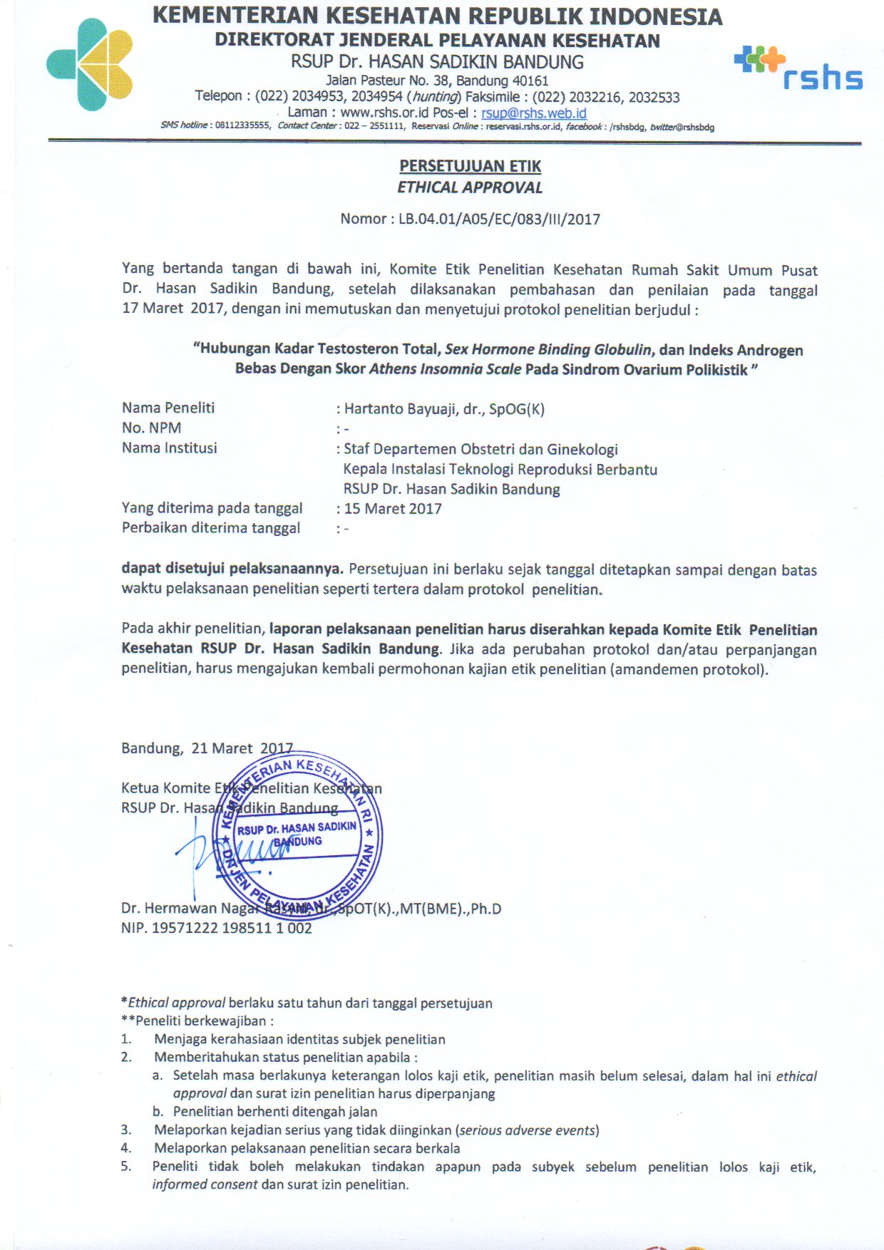 BACKGROUND: Polycystic ovary syndrome (PCOS), a common reproductive endocrinologic disorder in woman, was considered to be related to sleep disturbance. This study is aimed to analyze the correlation between excess androgen markers and Athens Insomnia Scale (AIS) in PCOS.METHODS: This observational, cross-sectional study of PCOS was conducted to 31 subjects to evaluate the correlation between serum total testosterone, sex hormone binding globulin (SHBG) and free androgen index with the incidence of sleep disturbance using AIS. Sleep disturbance was present if the score ≥6. The correlation between excess androgen markers and sleep disturbance was analyzed using Pearson’s coefficient of correlation or Spearman’s rho test. Correlation coefficient more than 0.5 with p<0.05 was considered significant.RESULTS: Out of 31 PCOS subjects aged 20-40 years, 39% subjects had AIS score ≥6. Mean serum testosterone in AIS score >6 group was higher than AIS score <6 group but not statistically significant (46.68 vs. 28.49 ng/mL, p>0.05). No significant correlation was found between serum total testosterone, SHBG and free androgen index with AIS score. After adjusting for AIS score, there was the moderate positive correlation between serum total testosterone level although not statistically significant (r=0.54, p=0.07).CONCLUSION: The serum total testosterone level might influence the occurrence of sleep disturbance in PCOS.KEYWORDS: PCOS, androgen excess, testosterone, sleep disturbance, Athens Insomnia Scale