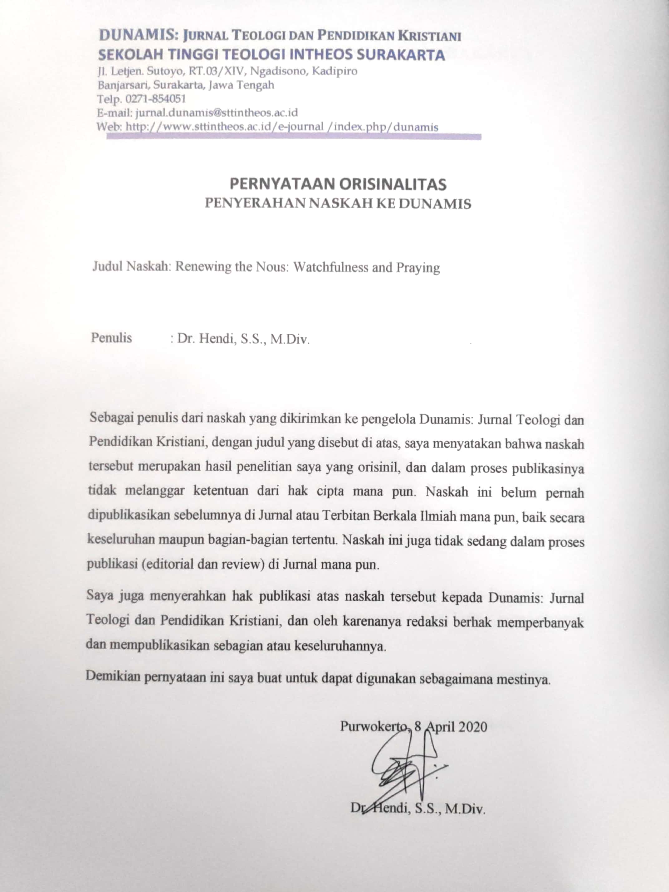 DUNAMIS: Jurnal Teologi dan Pendidikan Kristiani dengan nomor ISSN 2541-3937 (print), ISSN 2541-3945 (online) diterbitkan oleh Sekolah Tinggi Teologi Intheos Surakarta. Tujuan dari penerbitan jurnal ini adalah untuk mempublikasikan hasil kajian ilmiah dan penelitian dalam bidang ilmu Teologi Kristen, terutama yang bercirikan Injili-Pentakosta, dan bidang Pendidikan Kristiani.