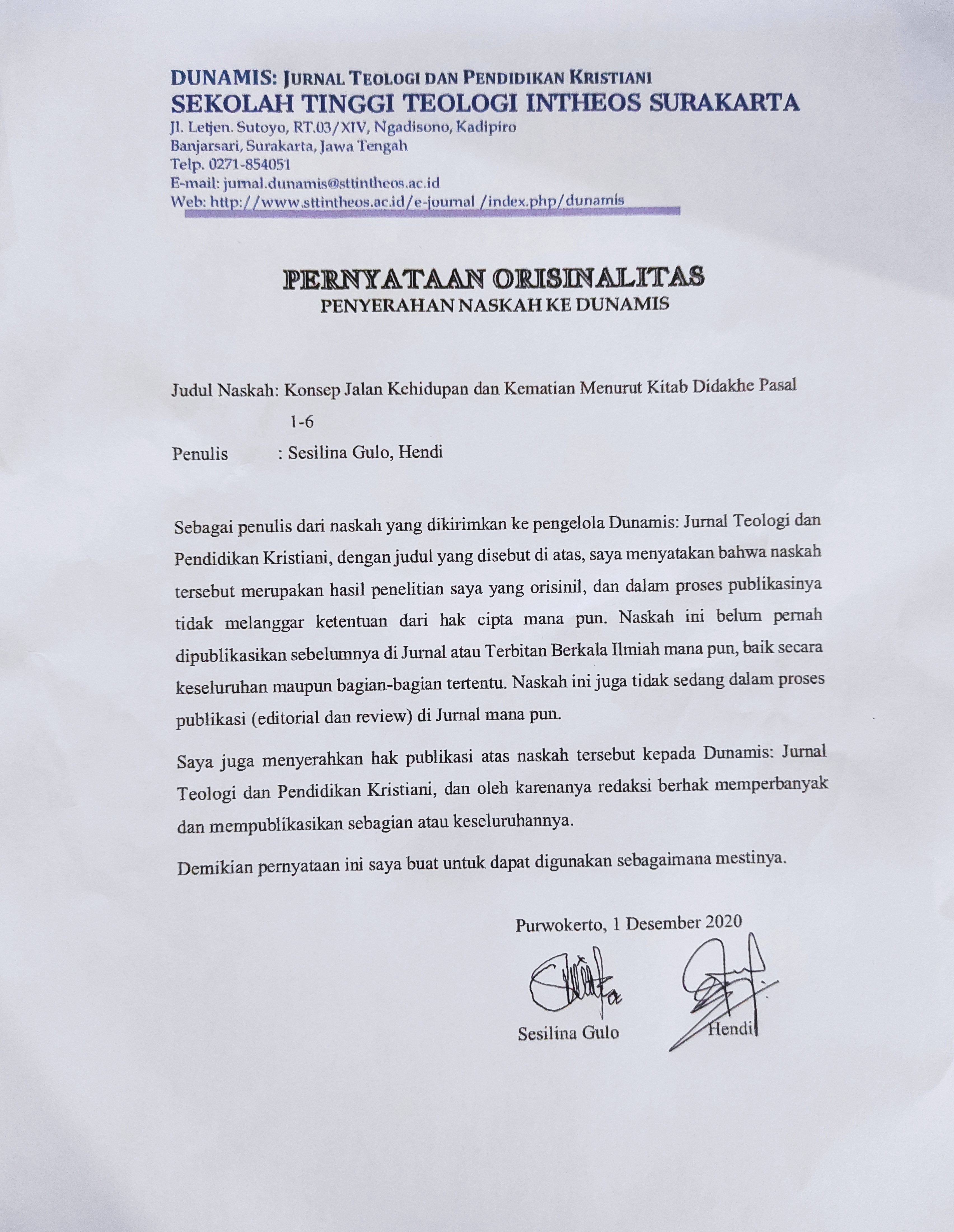 Abstract. The book of Didache is a non-canonical book in the Bible, therefore, the teachings of the book are not widely known, discussed, and taught. However, the book contains deep morality teachings. This article aimed to explore the teachings in the book so that we can explain the concept of the path of life and death as it was taught in the Bible. The study was conducted by using a descriptive-analytical approach based on Alistair Stewart’s view in his book “On the Way Life and Death, Light or Darkness: Foundation Texts in The Tradition.” From this study, that the teachings of the Book of Didache help believers to have spirituality discipline and lead to holiness of life so that believers no longer live in sins that will lead to death.Abstrak. Kitab Didakhe bukanlah Kitab kanonikal dalam Alkitab, oleh sebab itu ajaran dalam Kitab tersebut tidak banyak diketahui, dibahas, dan diajarkan. Namun demikian, Kitab tersebut mengandung ajaran moral yang dalam. Tujuan dari penulisan artikel ini adalah untuk menggali ajaran dalam kitab tersebut yang dapat menjelaskan konsep jalan kehidupan dan kematian sebagaimana yang diajarkan dalam Alkitab. Kajian dalam artikel ini menggunakan pendekatan deskriptif-analitis dengan mendasarkan pada pandangan Alistair Stewart dalam bukunya“On The Way Life and Death, Light or Darkness: Foundation Texts In The Tradition.” Dari kajian tersebut diperoleh hasil bahwa ajaran Kitab Didakhe menolong orang percaya untuk mendisplinkan diri dalam spiritualitas serta menuntun kepada kekudusan hidup sehingga orang percaya tidak lagi hidup di dalam dosa yang akan mendatangkan kematian.