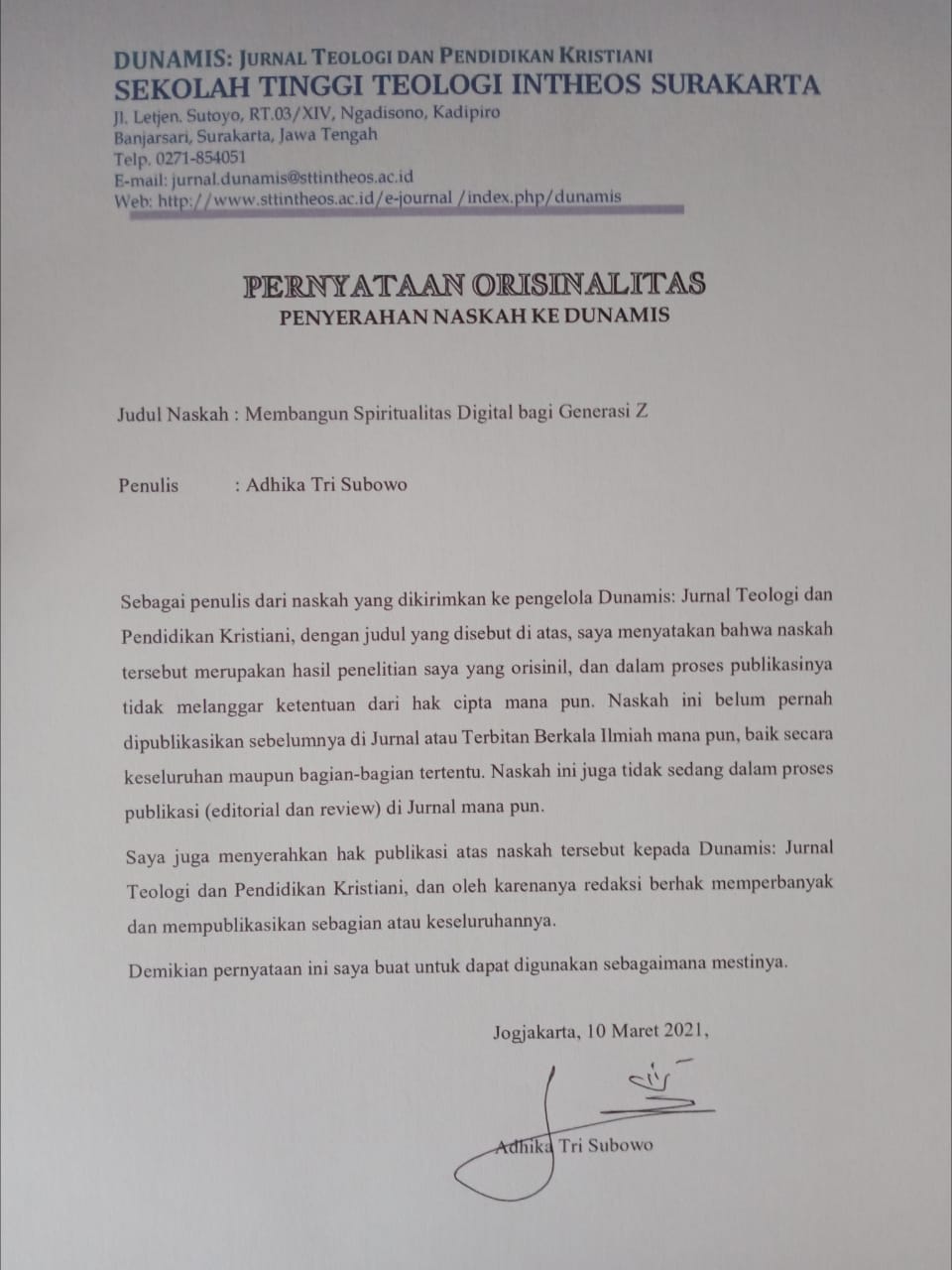 Abstract. Generation Z is a generation that is close to digital technology, so the use of digital space as a teaching tool is important for churches to do. The dichotomy of sacred and profane often colors the perception of the church in seeing the digital space, so that digital space has not been fully utilized. This research was intended propose the suitable digital spirituality for generation Z. This study was conducted by literature study. Through this study it could be concluded that cyberspace has become part of the generation Z spirituality, although the interactions and conversations in it are not always spiritually charged, therefore, the church needs to be involved in it to be able to provide guidance to generation Z.Abstrak. Generasi Z adalah generasi yang dekat dengan teknologi digital, sehingga penggunaan ruang digital sebagai sarana pengajaran menjadi penting untuk dilakukan oleh gereja. Dikotomi sakral dan profan seringkali mewarnai persepsi gereja dalam memandang ruang digital, sehingga ruang digital belum dimanfaatkan dengan maksimal. Penelitian ini dimaksudkan untuk mengusulkan spiritualitas digital yang tepat bagi generasi Z. Metode yang digunakan dalam kajian ini adalah studi literatur. Melalui kajian tersebut dapat disimpulkan bahwa cyberspace telah menjadi bagian dari spiritualitas generasi Z, meskipun interaksi dan percakapan di dalamnya tidak selalu bermuatan rohani, sehingga gereja perlu ikut terlibat di dalamnya untuk dapat memberikan bimbingan kepada generasi Z.