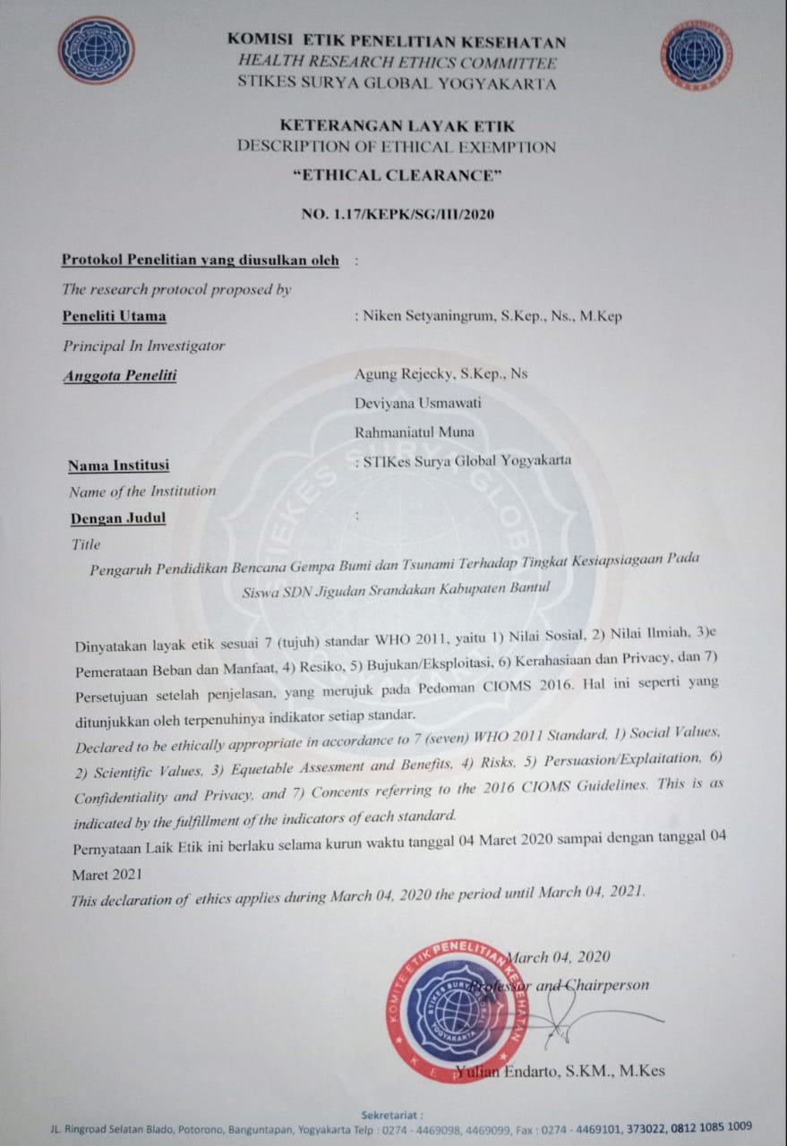 Background: Bantul regency.is one of the areas in which there is the danger of earthquakes and tsunamis. To minimize the impact disasters need to have knowledge on communities including elementary school students who are part of communities that are vulnerable to disasters. Objective: The purpose of this study was to understand the effects of earthquake and tsunami education on elementary school emergency planning Jigudan Pandak Bantul Yogyakarta. Research Methods: Quantitative precision using pre experimental methods. Approach used in one group pretest-posttest design. The population of this study was 46 students in 5 of grade of 10-12 years old. Sample taking used the total sample. The instrument used is a questionnaire. The statistical test for Wilcoxon. Emergency planning research before they gave education to earthquake and tsunami disasters total 15 responders (32.6%) ready, 22 reponders (47.8%) almost ready, 9 responders (19.6%) less ready. Research Results: Emergency planning after giving them earthquake and tsunami aducation total 35 responders (76.1%) completely ready, 11 responders (23.9%) ready. Statistical test using the Wilcoxon score (P: 0,00) was smaller than or equal to degrees of prospering α: 0.05 (p : 0,000 < 0,05 ). Conclusion: There was a significant impact on the readiness of emergency planning students before and after being given the education of earthquake and tsunami disasters. Keywords: Education Disaster Earthquake, Emergency Planning, Tsunami