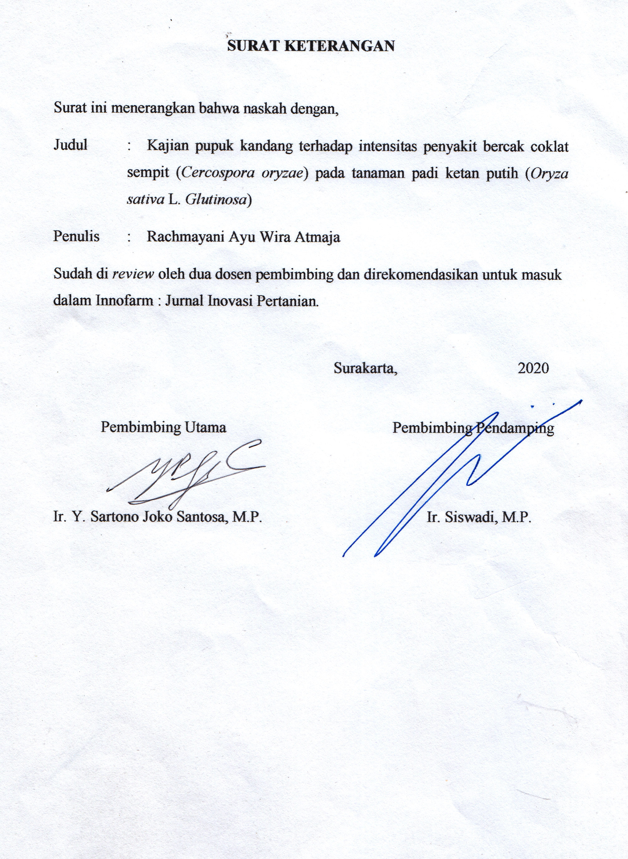 KAJIAN PUPUK KANDANG TERHADAP INTENSITAS PENYAKIT BERCAK COKLAT SEMPIT (Cercospora oryzae) PADA TANAMAN PADI KETAN PUTIH (Oryzae sativa L. Glutinosa) Rachmayani Ayu Wira Atmaja; Sartono Joko Santosa; Siswadi Siswadi