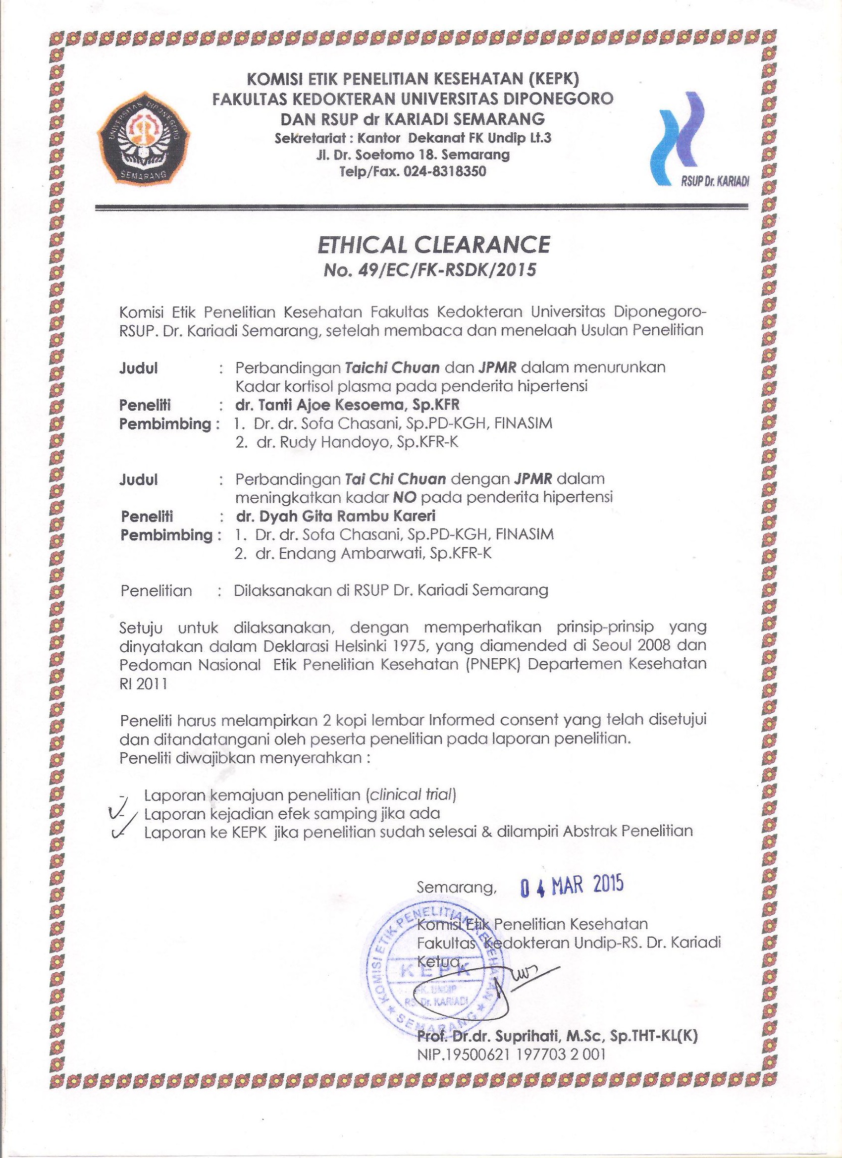 Nowadays, the prevalence of hypertension and its concomitant risk of cardiovascular and kidney disease development is increasing as the disability evidence in the society also rises. One of the potential risk factors of prehypertension is anxiety and it has already well-known that cortisol is a marker of anxiety. There are some nonpharmacologic methods to relieve anxiety: exercise and relaxation. Taichi Chuan is a low intensity aerobic exercise that also gives a relaxation effect.This study is organised to find out the effect of Taichi Chuan (TCC) and Jacobson’s Progressive Muscular Relaxation (JPMR) on cortisol level in pre hypertension patients. This is a pre and post-test design study with a total of 26 pre hypertension patients included. They were randomly divided into 2 groups. Group I performed Taichi Chuan exercise, while group II performed JPMR for 18 times. The intervention frequency was 3x/week for 6 weeks with 30 minutes duration for each session. In the study, which was held in April-June 2015, there was a decrease but no significant difference of cortisol concentration in both group.The comparison between groups also did not show statistical difference. However there were significant difference noted on the blood pressure before and after intervention in both groups.