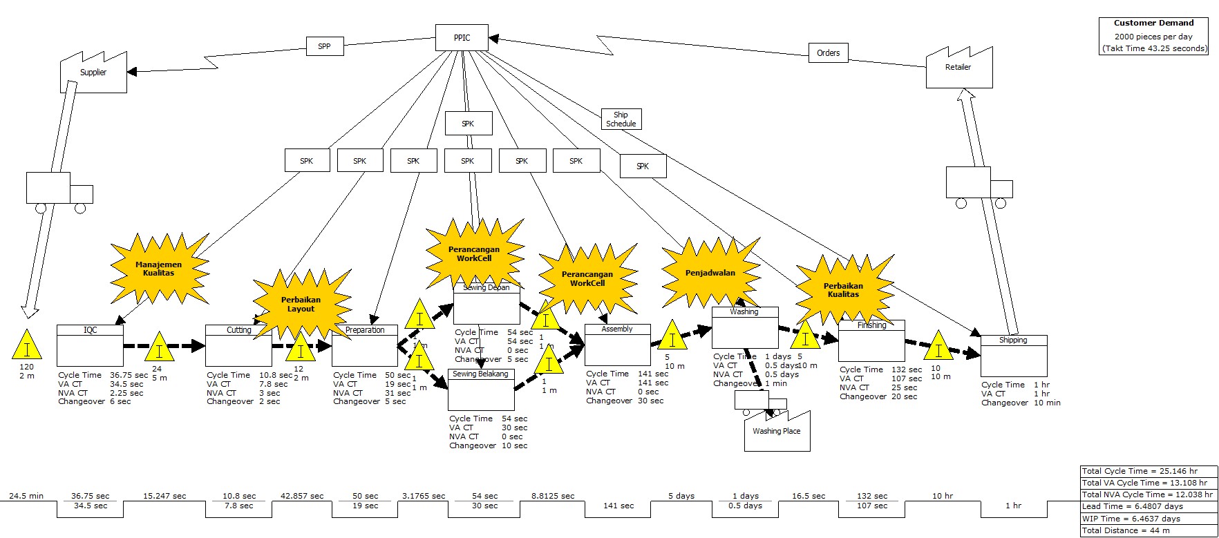 One of the big investment in a business is facility design. It is a long-term investment due to great value. In its development, PT. Dwi Putra Sakti faced some problems related to facility layout. Problems that can be identified, such as work in process that has accumulated on the production floor, as well as the anorganizad facility layout. Therefore, it is necessary to redesign the layout for the production process more effective and efficient. This study uses a lean manufacturing approach to redesign facility layout. It used value stream mapping, seven waste, cellular manufacturing and 5S principle. Analysis of the implementation result is used to design the layout of the new facility. Level layout that will be examined are the macro-and micro-layout layout. Results of macro-layout design is decreasing production cycle time of trousers. While the micro-layout design is decreasing in material handling displacement.