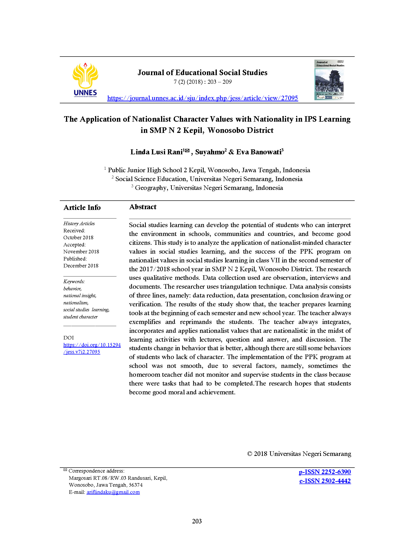 The Application of Nationalist Character Values with Nationality in IPS Learning in SMP N 2 Kepil, Wonosobo District Rani, Linda Lusi; Suyahmo, Suyahmo; Banowati, Eva